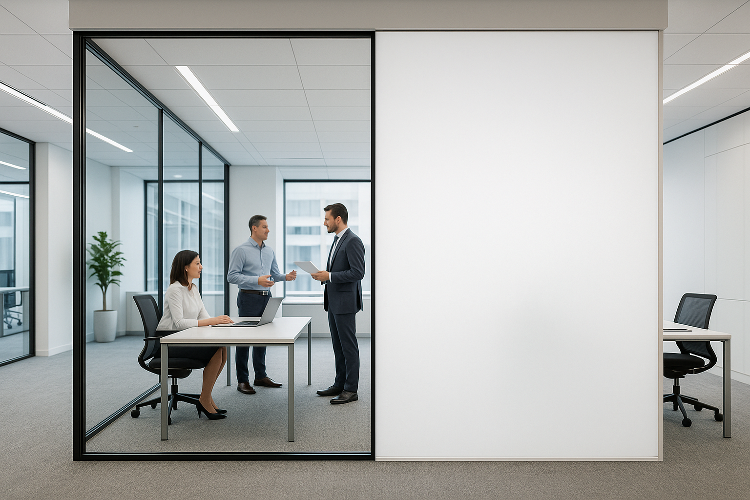 Vår teknik gör att glaset växlar från klart till frostat med ett knapptryck. Det ger både integritet och en modern känsla – perfekt för kontor, butiker och bostäder.